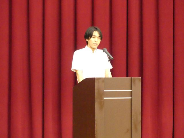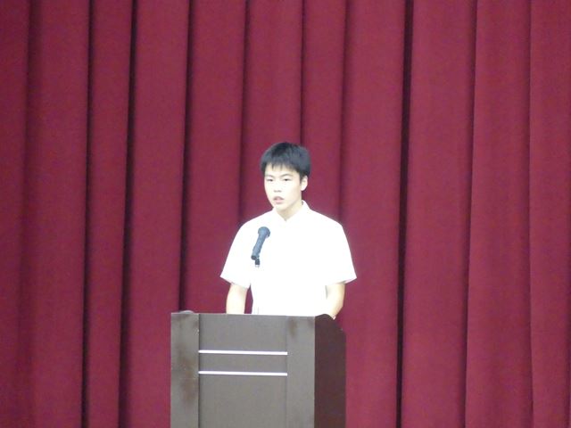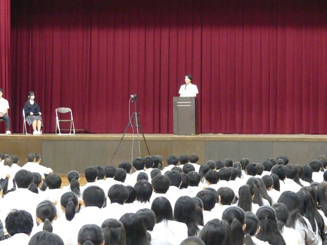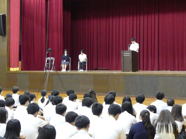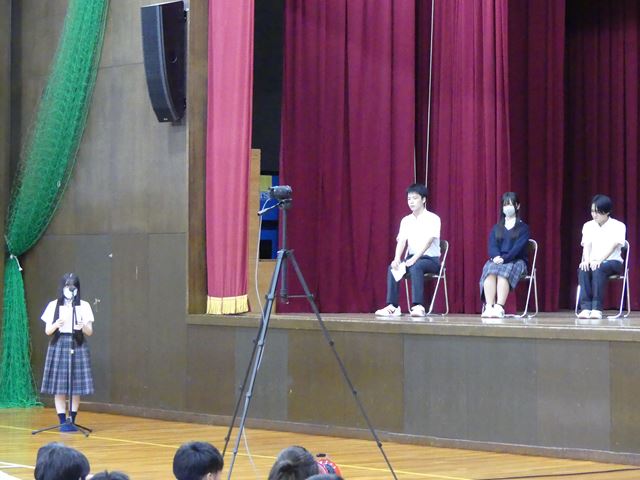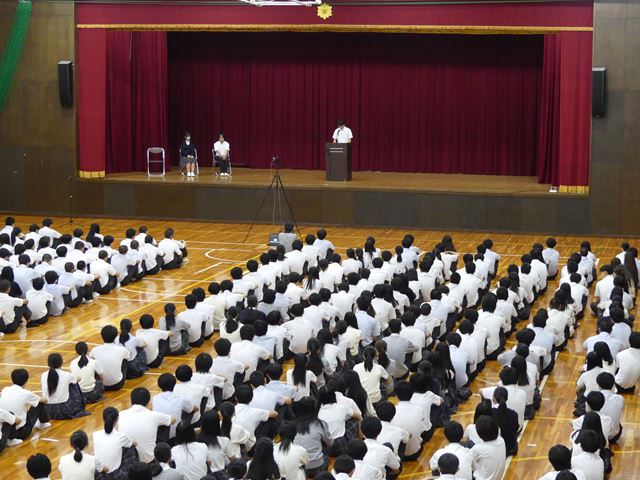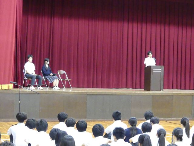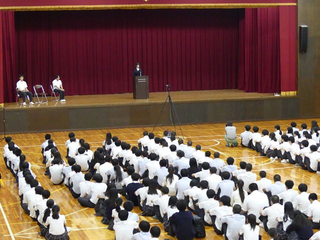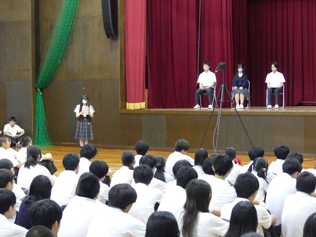 9月21日に生徒会選挙を行いました。立候補者は体育館で1年生と2年生を前に演説を行いました。3年生は教室でオンラインでの参加になりました。立候補者はそれぞれの思いや実現したいことを訴えました。