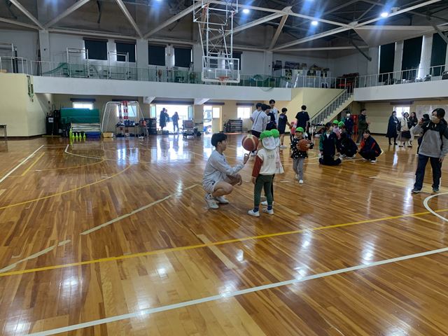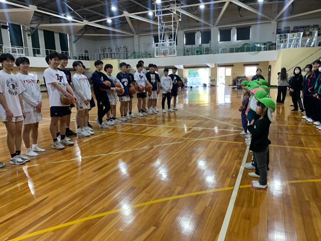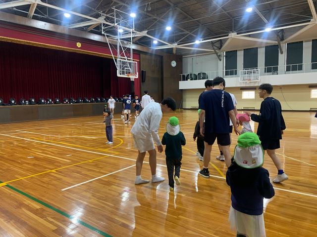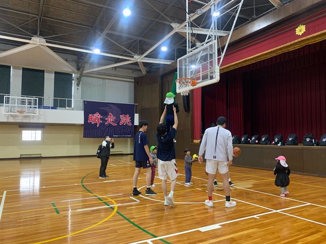 17日は育英高校に園児と一緒に見学にきて、バスケットボール部員と一緒にバスケットボールをしたり、英語を使った交流を行いました。