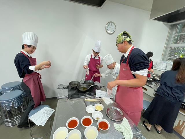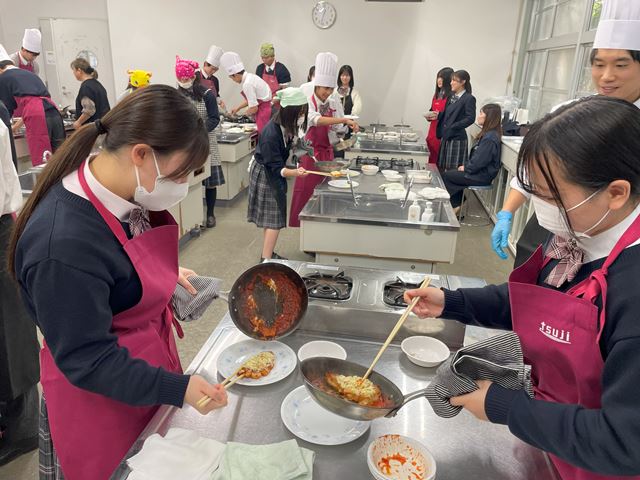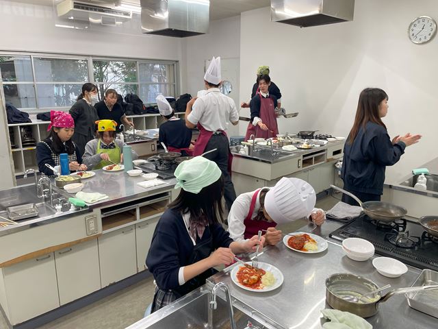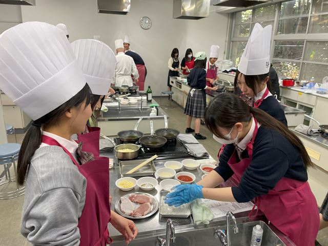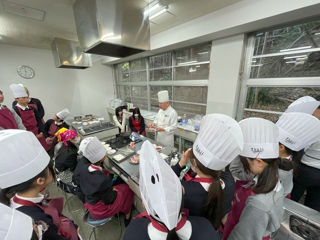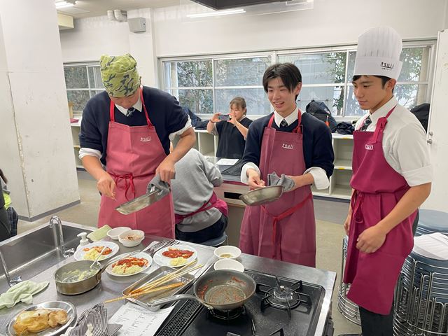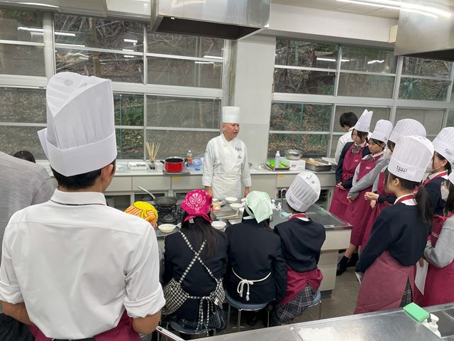 12月11日、調理体験イベントを実施しました。生徒18人が参加しました。辻調理師専門学校から講師の先生をお招きしておこないました。