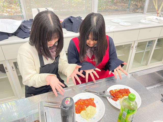 まずは先生が説明していただきながら、調理方法の説明を聞き、その後で指導を受けながら自分たちで行ってみました。盛り付けを行い、実食もしました。