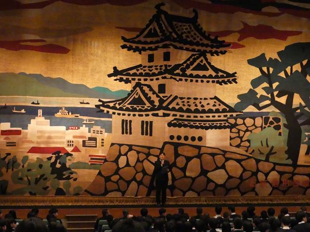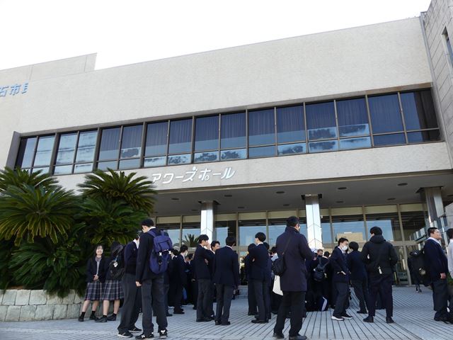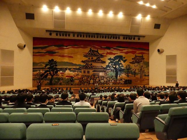12月13日に明石市民会館アワーズホールで芸術鑑賞会を行いました。今年は演劇を鑑賞しました。公演内容は、劇団自由人会様の「夢をかなえるゾウ〜青春ロボット編〜」を観ました。演劇を始めて観た生徒もいたと思いますが、ストーリーも面白く、楽しく鑑賞できたのではないでしょうか。