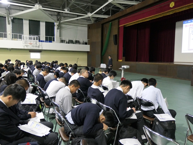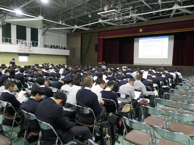 1年生は体育館にて文理選択講演会に参加しました。高校卒業後の進路を見据え、文系・理系それぞれの特徴や選択のポイントについて、全員で真剣に学びました。