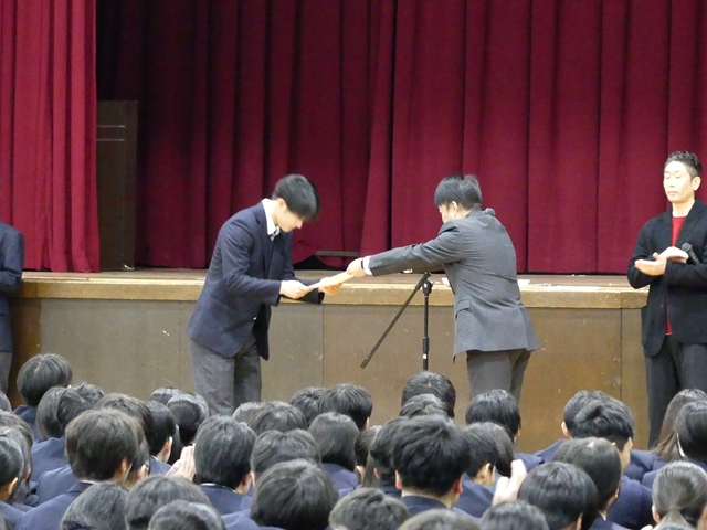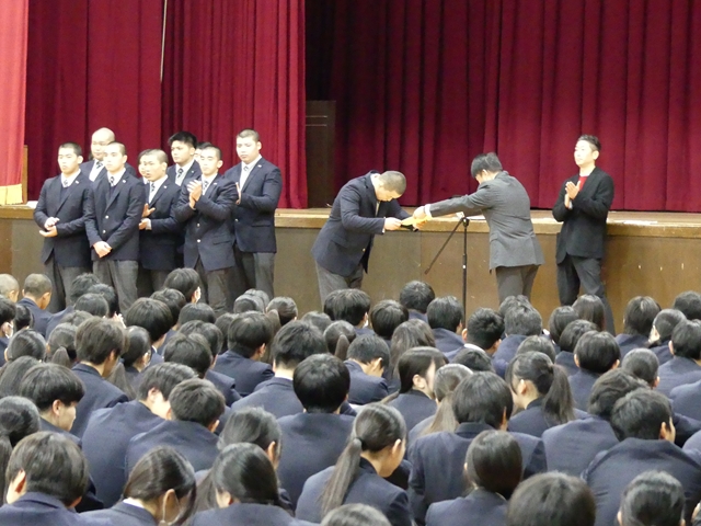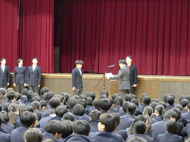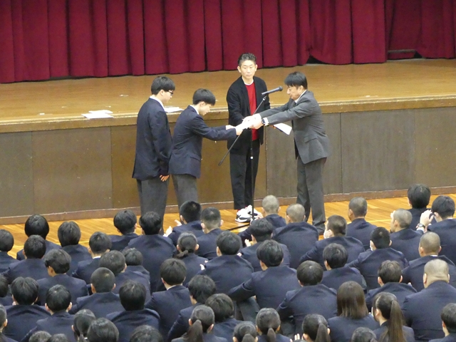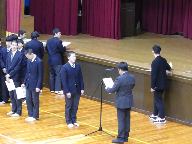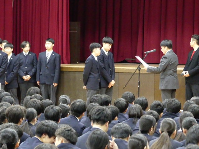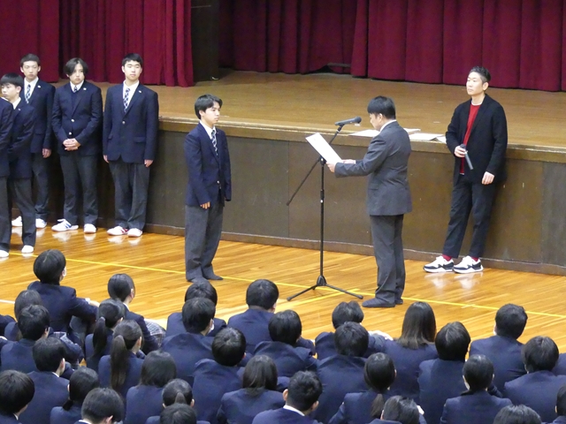 終業式の後には部活動の表彰式が行われ、各分野で素晴らしい成績を収めた生徒たちに温かな拍手が送られました。明日から冬休みに入ります。健康や安全に気をつけ、新学期にまた元気な姿で登校してくるのを楽しみにしています。