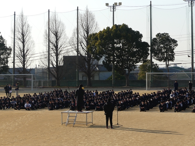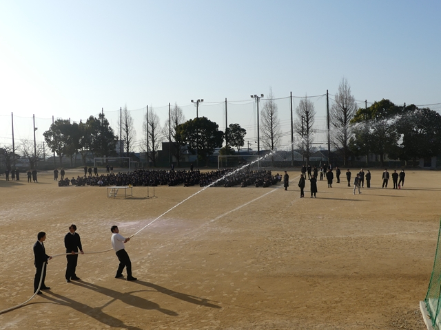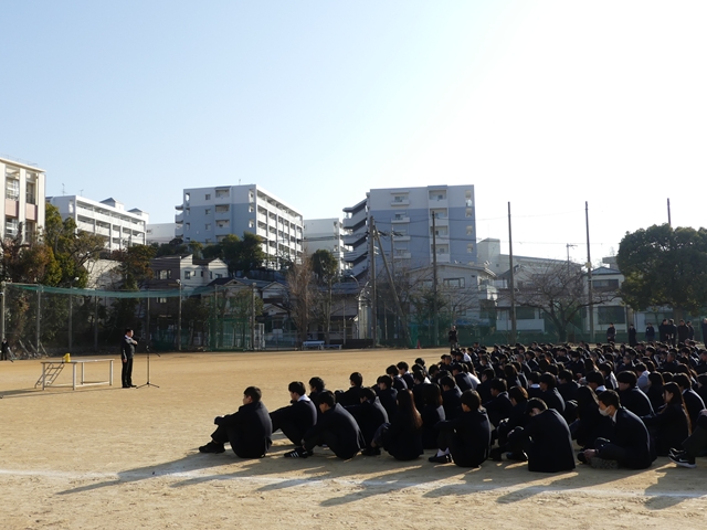 火災発生を想定し、生徒たちは指示に従って速やかに運動場へと避難。全員の点呼を終えた後、阪神・淡路大震災等の災害で犠牲になられた方々に対し、全員で静かに黙祷を捧げました。