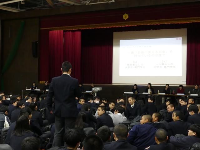 クイズ形式で大学や専門学校の実態を学び、生徒は挙手で予想に参加しました。失敗談や学習のアドバイスに対し、教員が最新情報を補足する形で行いました。
